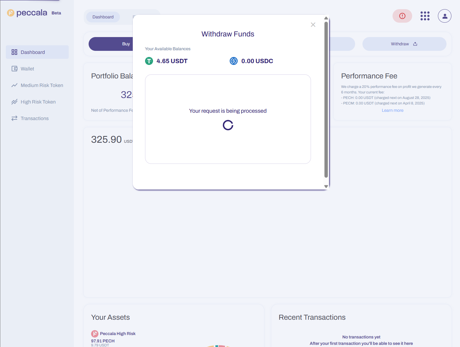 When you sell your Peccala tokens, the proceeds are credited in USDT to your Peccala wallet. If you prefer, you can convert this balance into USDC before withdrawing.